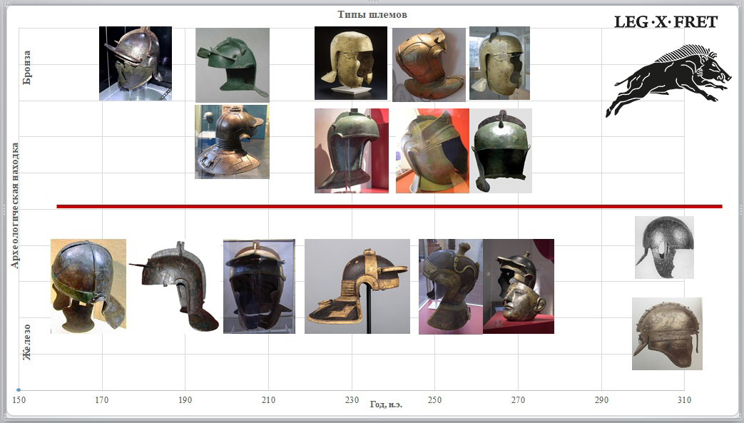 Со второй половины 2 века н.э. в римской армии получили распространение шлема типа "Нидербибер", ставшие вершиной эволюции имперских шлемов эпохи принципата. Согласно археологическим находкам, шлема этого типа могли изготовляться как целиком из бронзы или стали, так и из стали с бронзовыми элементами. Также до середины 3 века н.э. применялись шлема типа Imperial Italic H по классификации Робинсона, наиболее известные находки этого типа — шлем из Нидермомтера и "шлем с мышами".